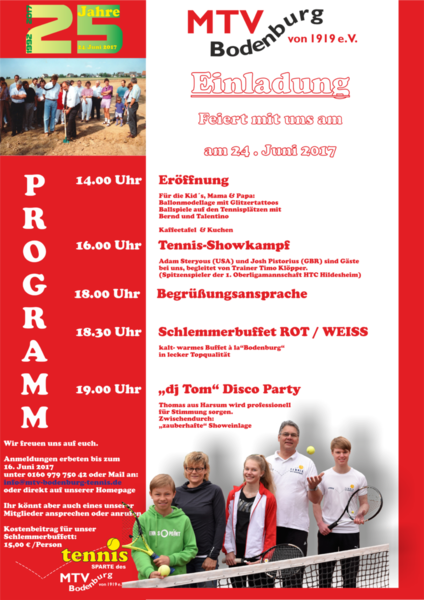 Mit einer Programmgestaltung für Jung und Alt wurde am 24.06.17 bei tollem Wetter gefeiert. Für die Jüngsten war auf den Plätzen ein Trainingsparcour aufgebaut. Der sportliche Höhepunkt des Tages war zweifelsfrei ein Show- und Trainingseinlage von den Tenniscracks Adam Steryous (USA) und Josh Pistorius (GB). Trainiert von Timo Klöpper spielen beide beim HTC Hildesheim, die vielen Zuschauer auf dem MTV Gelände waren begeistert.