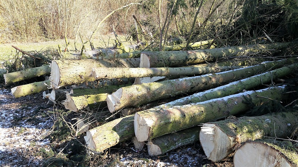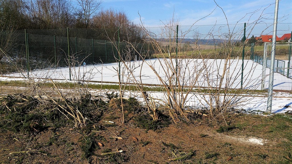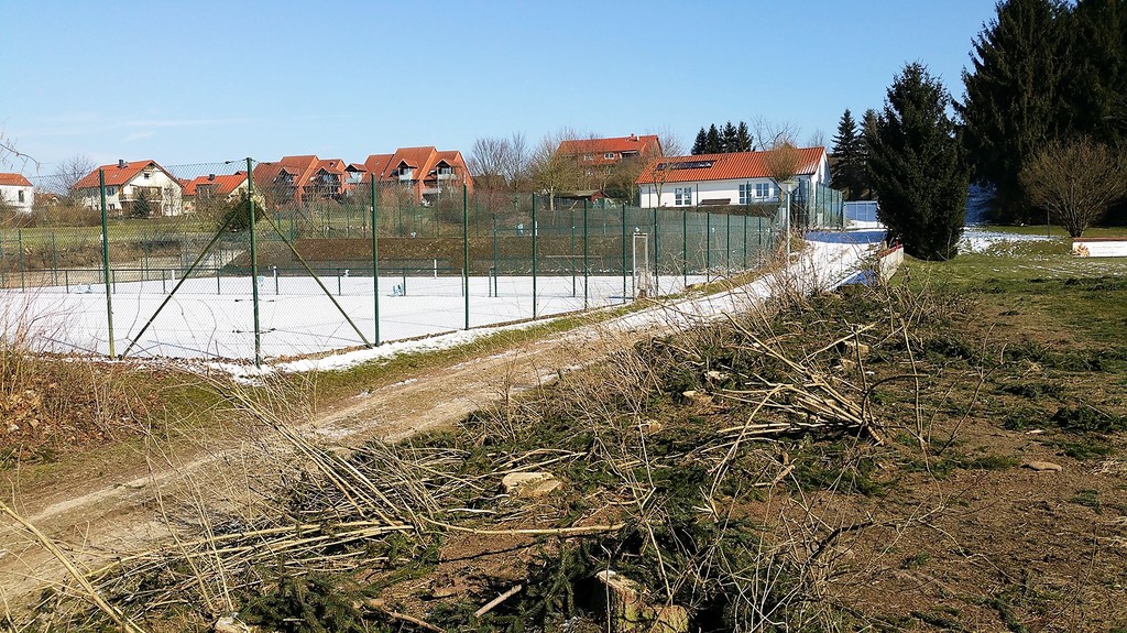Schon lange haben wir hierauf gewartet, es wird ein Ballfangzaun zwischen dem Sportplatz und unserer Tennisanlage errichtet. Die Bäume sind gefällt und wurden auf unserem Parkplatz zwischen gelagert. Die Stämme wird die Stadt verkaufen, der Rest wird geschreddert.