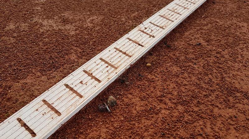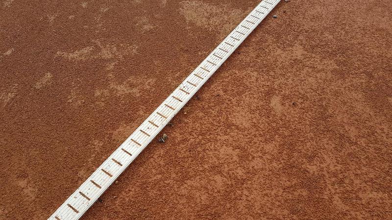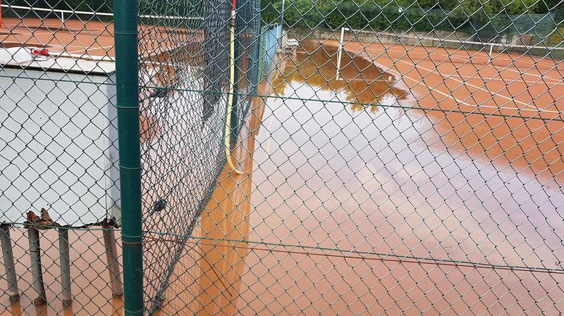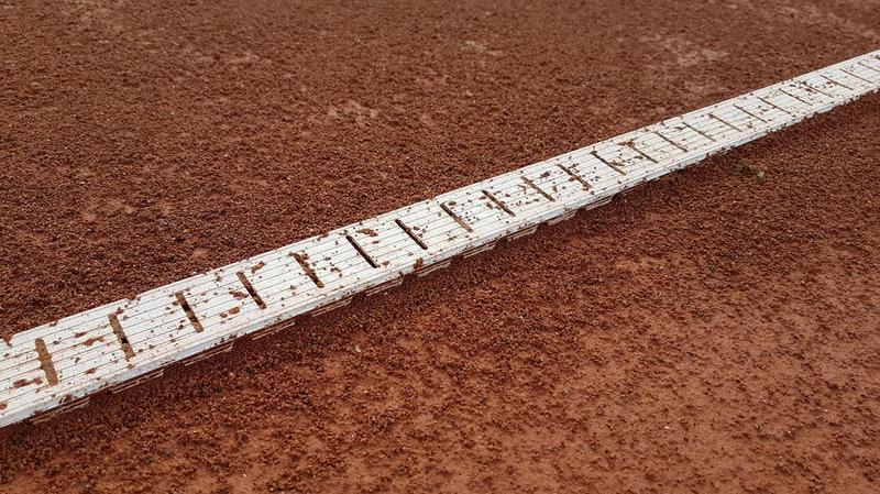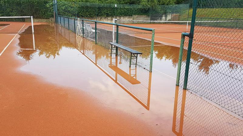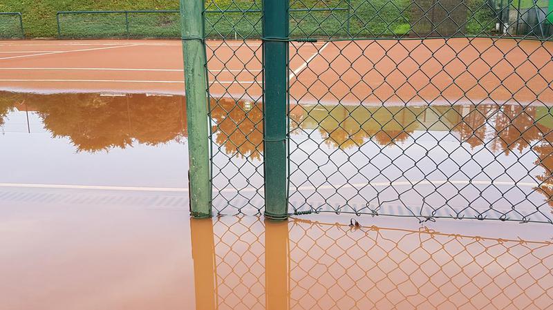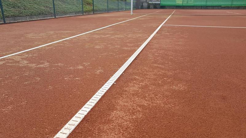 Eine böse Überraschung mussten wir am 15.08.20 zur Kenntnis nehmen: Unsere Tennisplätze wurde durch den Starkregen geschädigt, die Linien waren zum Teil freigespült. 2 to. Sand waren einfach verschwunden, die Kanalisation beförderte viel in den Borbach.
