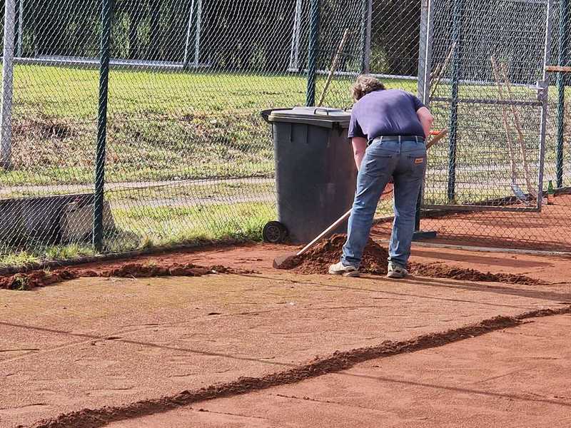 Nein, zehn starke Männer haben heute alle drei Plätze und um die Plätze herum von Blättern und Dreck befreit. Der alte Sand wurde zusammengkratzt und ist abfahrbereit. Nächsten Samstag soll es weitergehen, die Häufchen werden mit Karre und Muskelkraft in den Container gefahren.